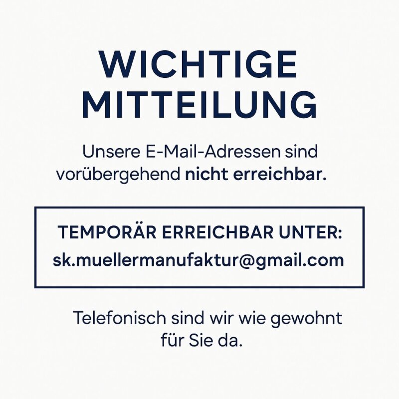 Derzeit sind wir aufgrund eines technischen Ausfalls unseres Hosting-Anbieters nicht über unsere üblichen E-Mail-Adressen erreichbar. Wir arbeiten bereits intensiv an einer Lösung.